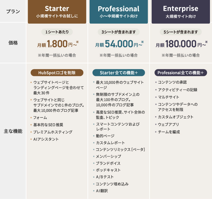 HubSpotは無料でも始められる点が魅力ですが、よりマーケティングを推進するための多くの機能は有償プランでご利用いただけます。主なプランの違いは以下の通りです。