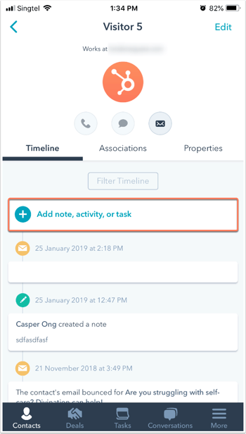 HubSpot モバイルアプリでコメント、アクティビティ、またはタスクのログを記録する