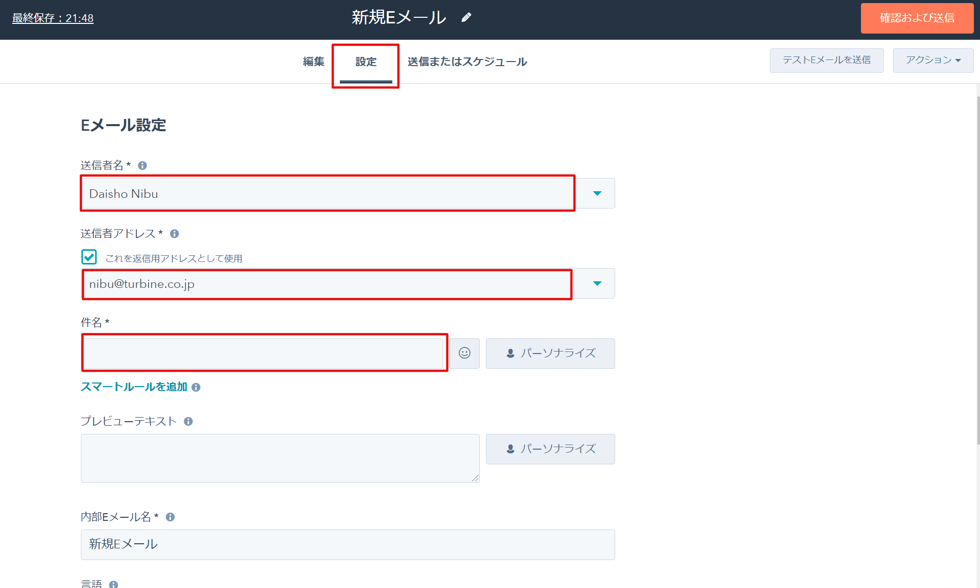 - 「設定」タブより、送信名、送信アドレス、メール件名などを入力します。