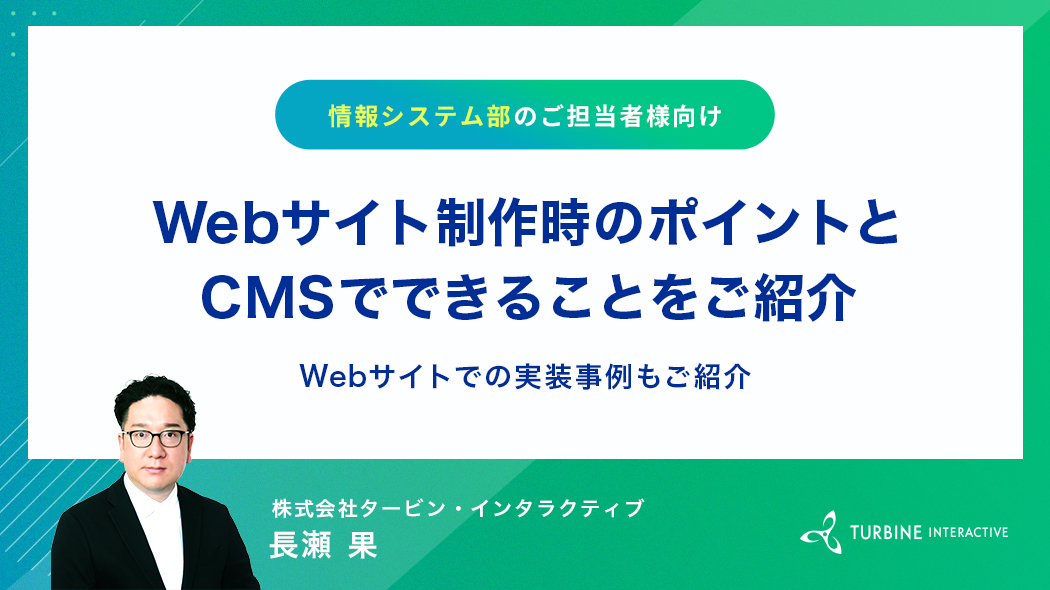 【録画再配信】情報システム部のご担当者様向け Webサイト制作時のポイントとCMSでできることをご紹介 ~Webサイトでの実装事例もご紹介~ アーカイブ配信 マーケティング全般 B2B ウェビナー Webサイト ENTRY アーカイブ動画視聴はこちら 「Webサイトリニューアルの際、何をすればよいかわからない…」「CMSって聞いたことあるけど、どんなメリットがあるの?」とお悩みの企業の情報システム部の方も多いのではないでしょうか?本セミナーではタービン・インタラクティブ の長瀬が、情報システム部のご担当者様向けに『Web制作前に整理しておくべき要件・注意しておくポイント』『CMSでできること』について解説していきます!※こちらは2024年6月27日に配信したウェビナーの録画再配信となります。 次の問題意識をお持ちの方にオススメです 情報システム部の方 Webサイトリニューアルを検討されている方 CMSを利用したいと考えている方 セミナー内容 情報システム部としてWeb制作前に整理しておくべき要件・注意しておくポイント CMSとは CMSでできること WebサイトでのCMS実装事例 ※ウェビナーの内容は一部変更になる可能性がございます。 ENTRY アーカイブ動画視聴はこちら セミナー概要 お申込みいただいた方には、後日オンデマンド動画へのアクセスURLをお送りさせていただきます。 講師のご紹介 長瀬 果 株式会社タービン・インタラクティブ 社長室 精密メーカーの制御系システムエンジニアを経験後、大手自動車メーカーのマーケティングプランナーとして従事。2014年よりHubSpotを活用したマーケティング戦略、データ連携の設計、実装を担当。顧客・エンドユーザー双方の視点を取り入れつつ、HubSpot機能面からクライアント活用を提案。 ENTRY アーカイブ動画視聴はこちら